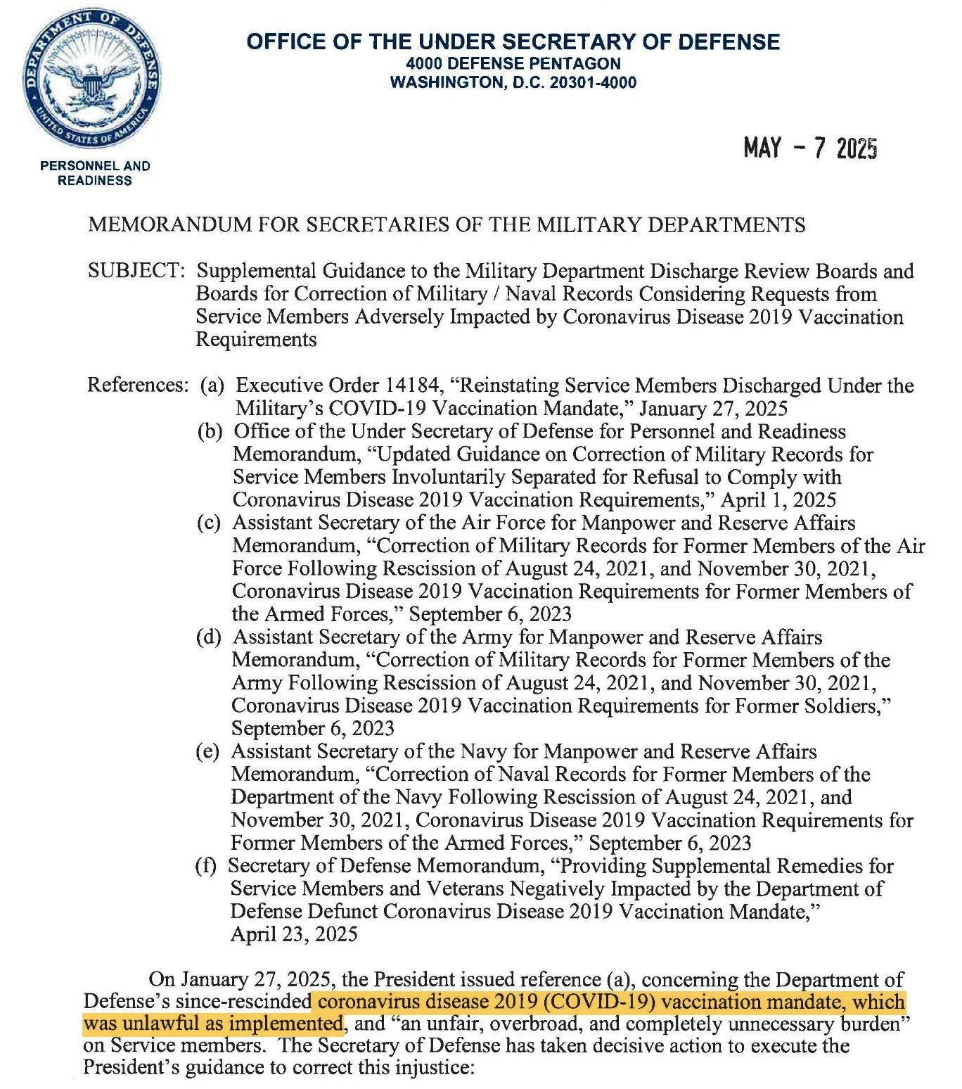 The Executive Order signed by President Donald Trump on January 27 calls for the reinstatement of those military personnel who were released due to their refusal to comply with the 2021 COVID-19 mRNA shot order. The order guarantees complete reinstatement, including benefits restoration and back pay. Within months, on May 7, Secretary of Defense Pete Hegseth sent a formal note to Department of Defense leadership declaring the directive "unlawful as implemented."
