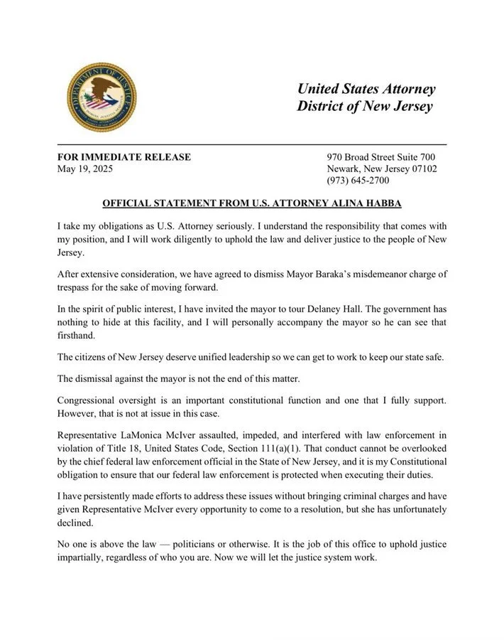 During the May 9th confrontation at Delaney Hall, McIver "assaulted, impeded, and interfered with law enforcement," according to Acting U.S. Attorney Alina Habba, in violation of Title 18, U.S. Code § 111(a)(1). "No one is above the law — politicians or otherwise," Habba said, emphasizing that she gave McIver "every opportunity to come to a resolution" before bringing charges. Ras Baraka, the mayor of Newark, who was detained that same day on suspicion of trespassing, will not face charges. The firing was decided "for the sake of moving forward," according to Habba.