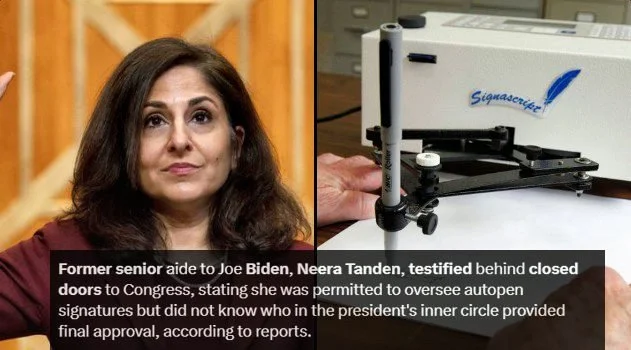 While she was authorized to direct autopen signatures on critical documents, Neera Tanden—a former top Biden aide—confessed to Congress that she was unaware of who granted final permission. Her testimony is being made at a time when former president Biden's mental capacity and the use of electronic signatures for official acts are under increasing scrutiny.
