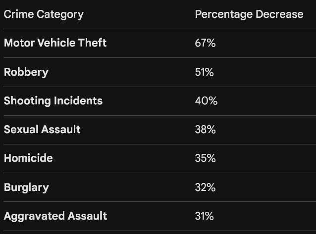 The administration released data indicating that overall crime in Memphis has dropped by more than 43% compared to the previous year. The breakdown of specific crime categories shows a broad decline in violence and theft: