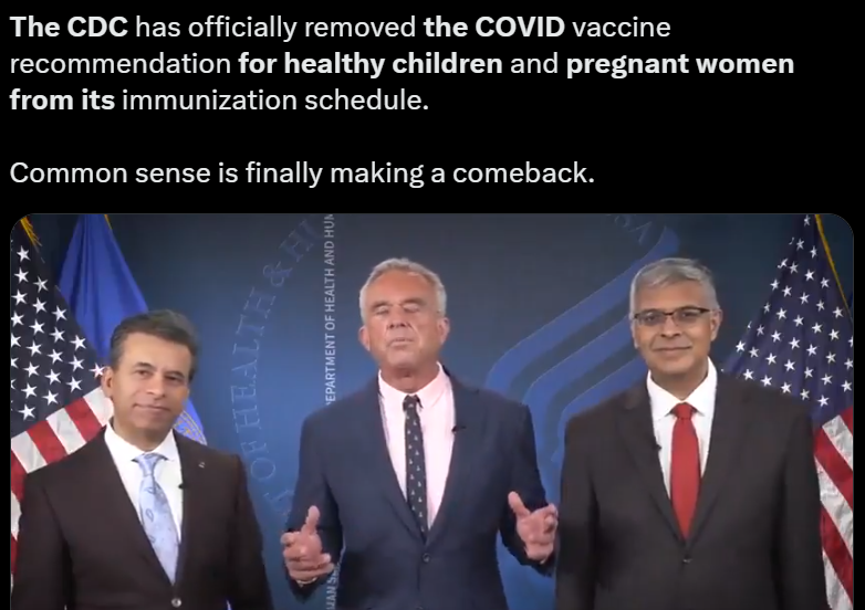 Robert F. Kennedy Jr., the health secretary, made the news Tuesday and confirmed the decision in a statement posted on X. Kennedy declared, "As of today, the @CDCgov recommended immunization schedule no longer includes the COVID vaccine for healthy pregnant women and healthy children." In summary, it's sound science and common sense. The pledge made by @POTUS to "make America healthy again" is now one step closer to being fulfilled.
