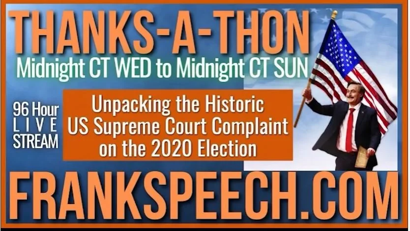 Thanks-A-Thon, a 96 hour live streaming event, will air on FrankSpeech.Com, starting from 12:AM (CT) Thanksgiving morning to midnight (CT) on Sunday November 28. Please make sure you join Mike Lindell in his patriotic effort to unpack the historic US Supreme Court Complaint on the 2020 Election. The Thanks-A-Thon will also break down the crimes committed during the 2020 election.