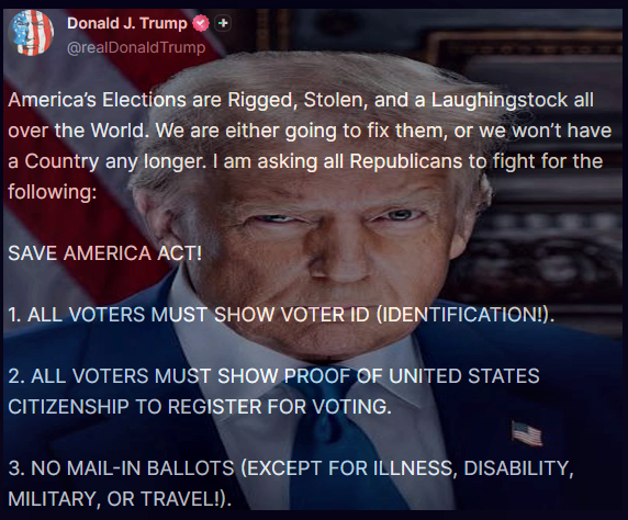 Trump stated in recent speeches and social media posts that elections must be held "legally and honestly" and that the federal government should intervene if states are unable to do so. He has urged Congress to take action on several occasions, pushing for the SAVE America Act to be passed and demanding stricter guidelines for voting procedures and eligibility.